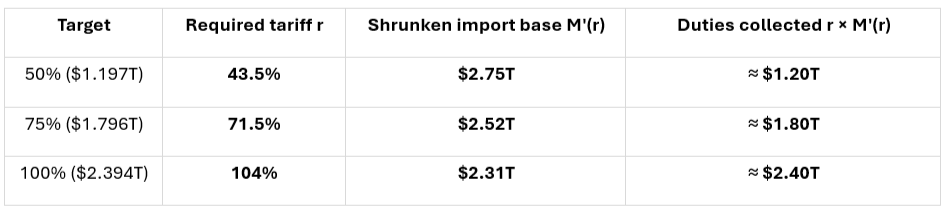 If we wanted to replace 75%, the target jumps to nearly $1.8 trillion, requiring an effective tariff rate of about 54.5%.